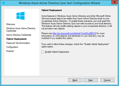 | Checking this box allows some attributes to be written back to your Active Directory, which is necessary for a Hybrid Exchange Server scenario. | ![]() |